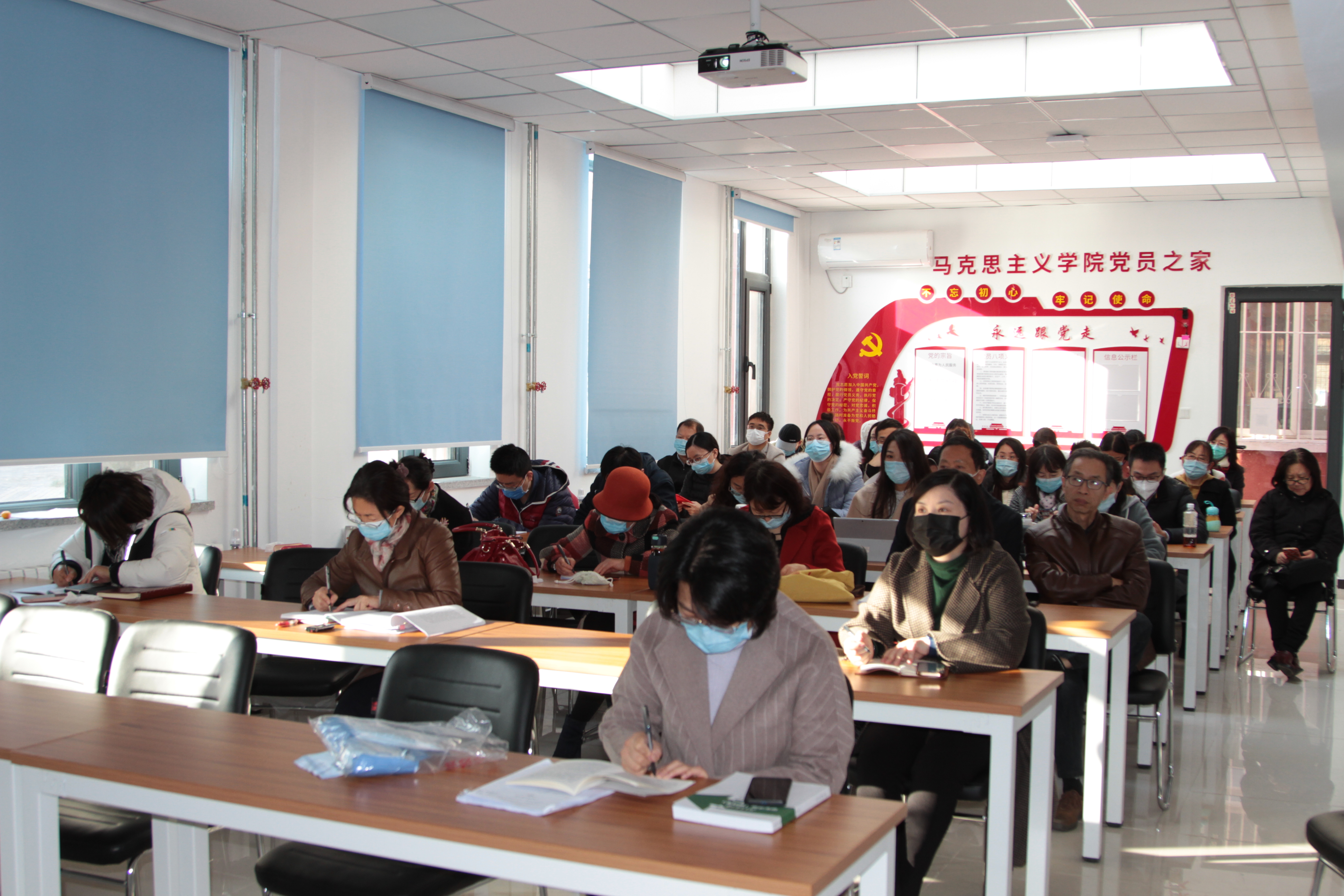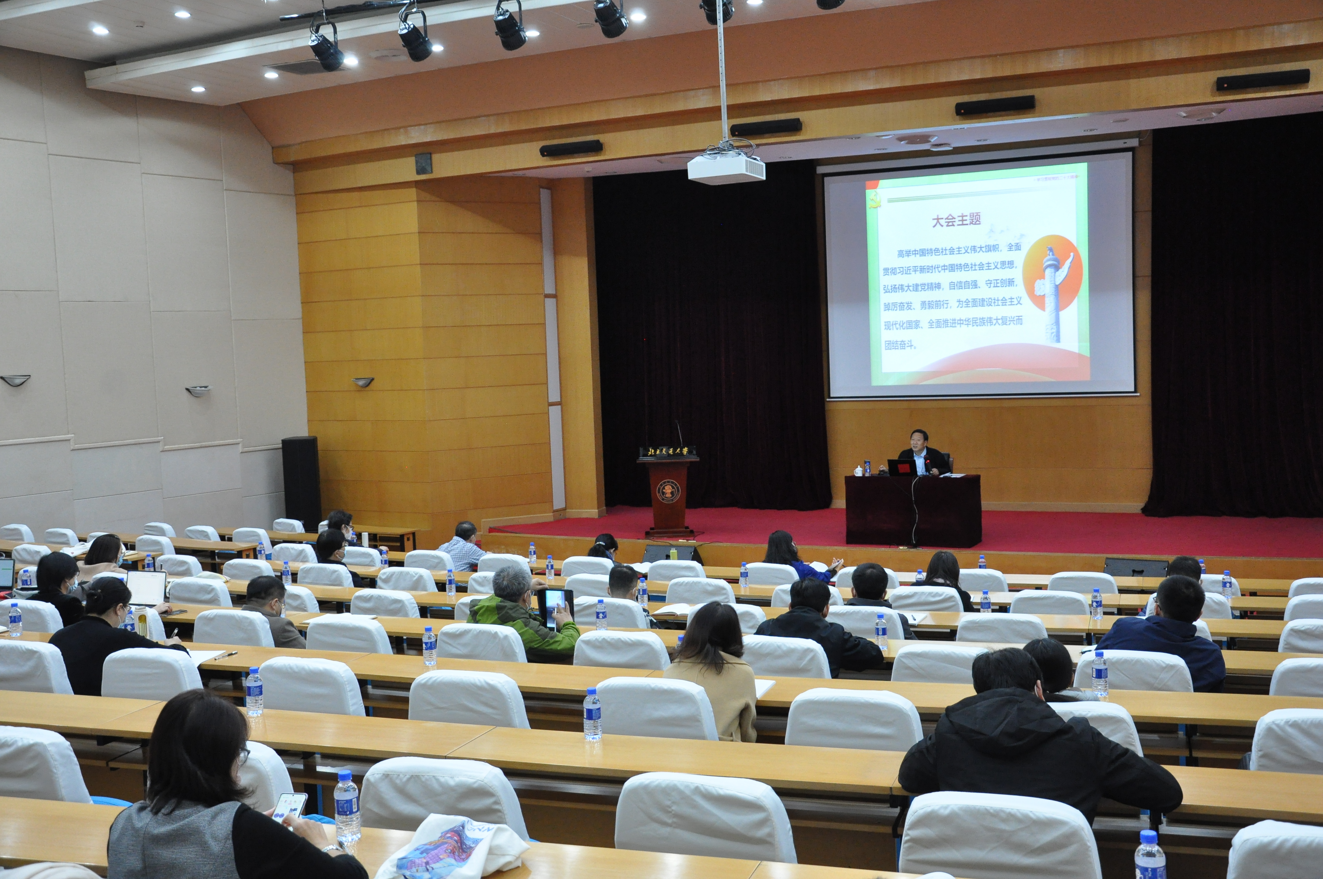 宣讲现场,与会人员专注聆听,反响热烈,纷纷表示将以实际行动落实党的二十大精神,把服务国家战略作为重要使命,为建设交通强国、教育强国不懈奋斗,为全面建设社会主义现代化国家、全面推进中华民族伟大复兴而团结奋斗。因疫情防控要求,此次学习采取线上线下相结合的方式在各学院设置分会场,马院全体思政课教师及各学院党员师生参加学习。