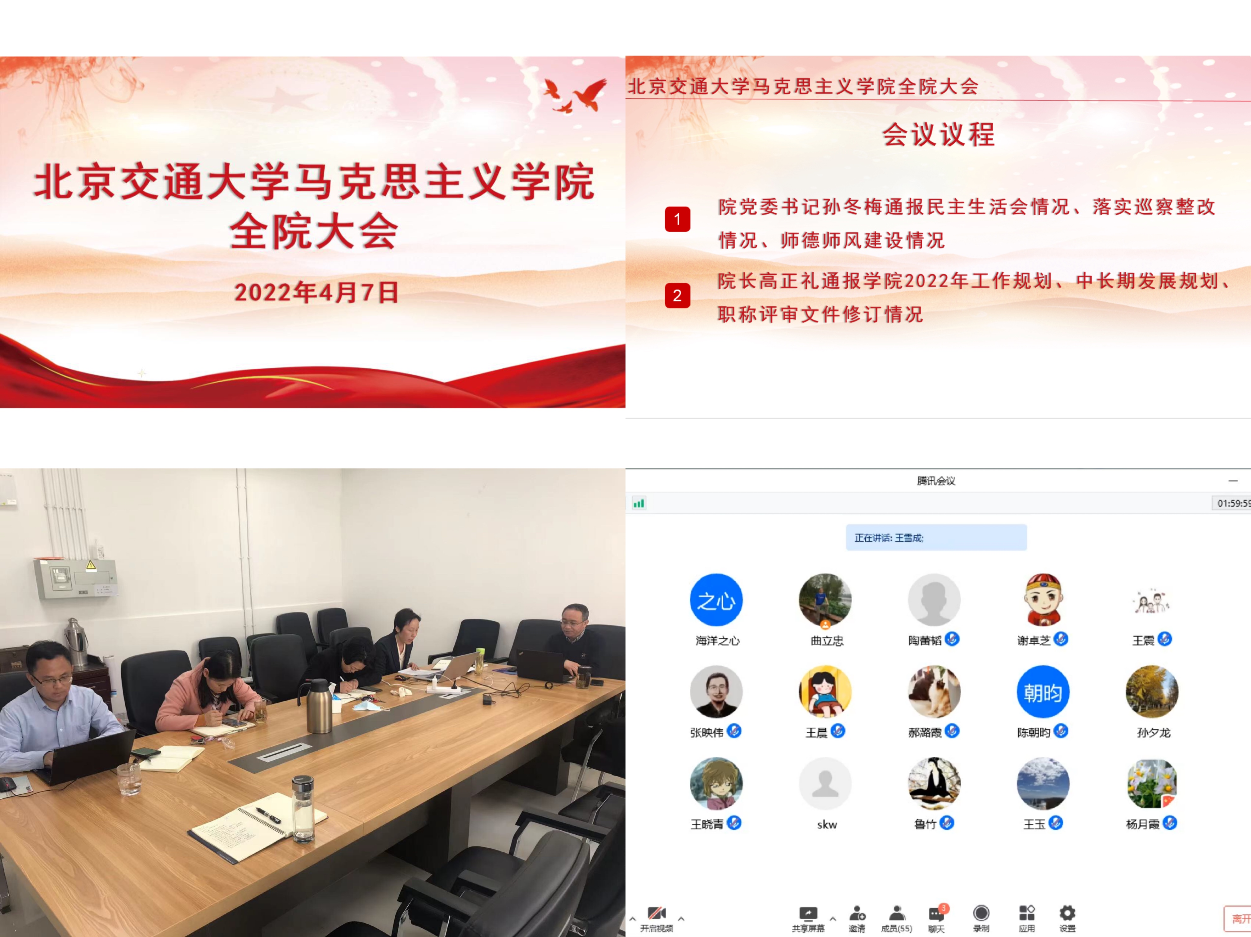 2022年4月7日下午,玩球直播 2022年度第一次教职工大会顺利召开,根据学校疫情防控要求,此次会议采取线上线下相结合的方式。院领导班子全体成员及全院教职工参加会议。学院党委副书记、副院长田永静主持会议。