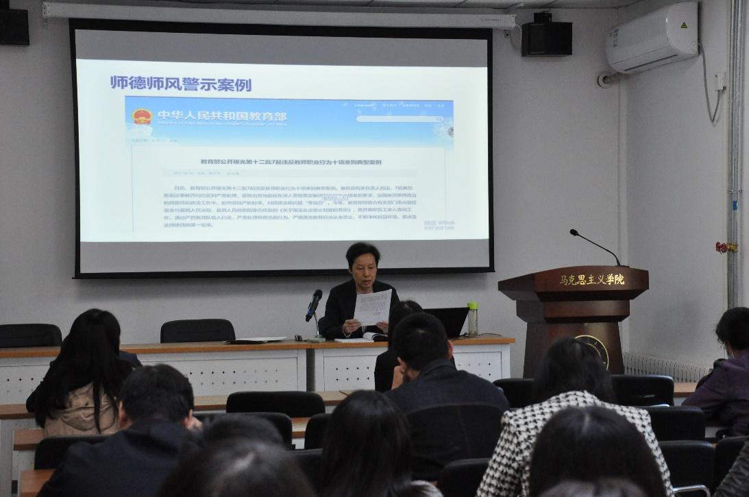会上,党委书记孙冬梅首先对学校新出台的《玩球直播 教师理论学习制度》《玩球直播 师德师风考核办法》和《玩球直播 教师师德失范行为处理办法》3个文件进行详细解读,并通过教育部公开曝光的第12批违反教师职业行为十项准则典型案例和校内外近年违反师德事例进行警示教育,要求学院教师们要坚守师德规范,牢记育人使命。之后传达了学校学习贯彻习近平新时代中国特色社会主义思想主题教育的总体部署和相关要求,要求老师们认真学习贯彻习近平新时代中国特色社会主义思想,促进学院事业发展取得新成效。