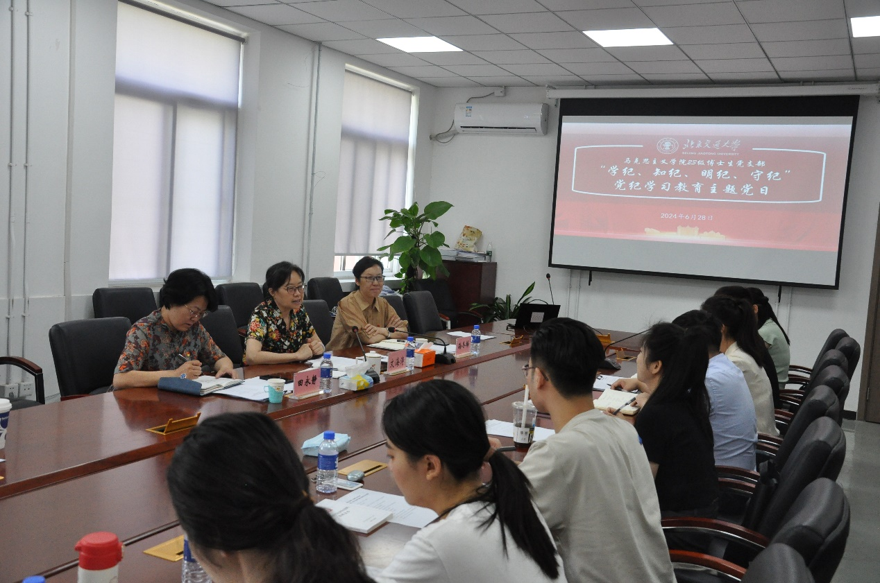 2023级博士生党支部书记王晨汇报党支部建设整体情况和党纪学习教育阶段性成果,支部党员彭云青、韩卓鹏、马越围绕党纪学习教育等方面进行了理论微宣讲展示,支部党员结合自身学习体会和宣讲内容交流了心得感想,支部副书记李妍对下一步支部建设工作设想进行了汇报。